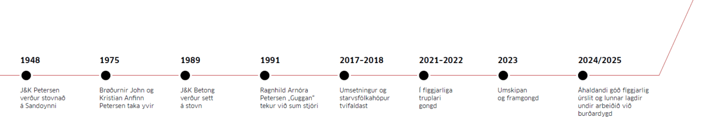 J&K Betong, ið er eitt dótturfelag hjá J&K Petersen Contractors, er ein sjálvstøðugur partur av virksemi felagsins. J&K Betong veitir betong til nógv viðskiftafólk kring Føroyar, eins og J&K Betong eisini veitir betong til ymisk arbeiðir hjá J&K Petersen Contractors. Byrjað varð við hesum virksemi í 1989.